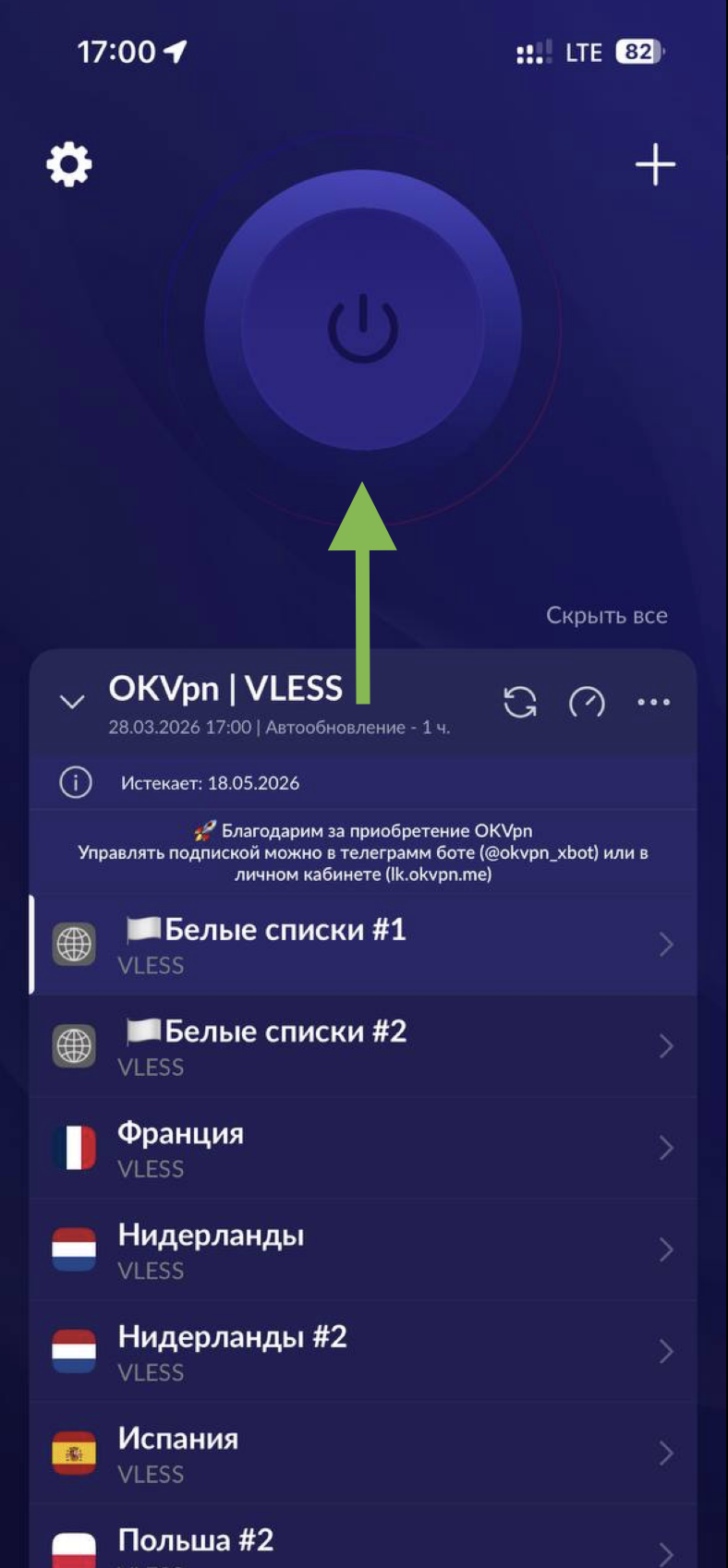 Вам нужен ключ, который выглядит как большая строка со случайными символами и начинается с https://. Ключ приходит после оплаты, но его всегда можно заново получить, если есть активная подписка на OKVpn