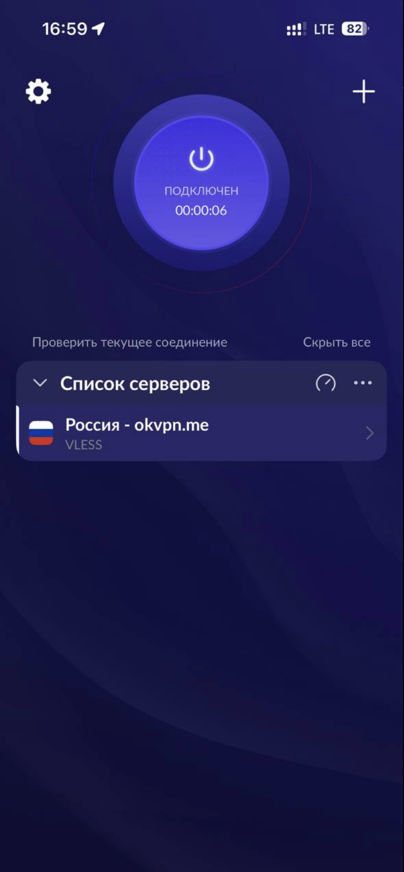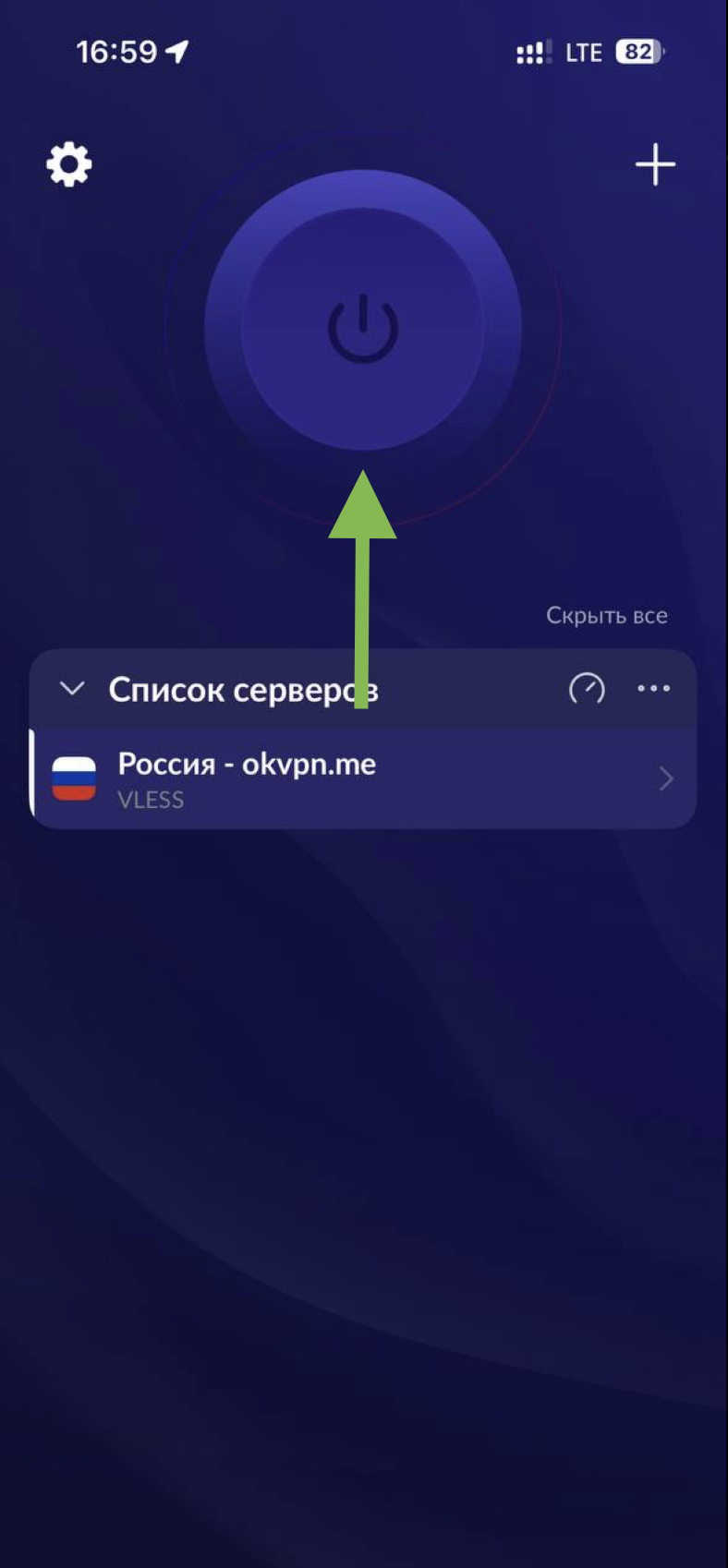 Вы успешно вставили ключ. Нажмите на синюю кнопку в центре, чтобы включить VPN. После подключения кнопка подсветится. Чтобы отключить VPN — нажмите на кнопку в центре еще раз