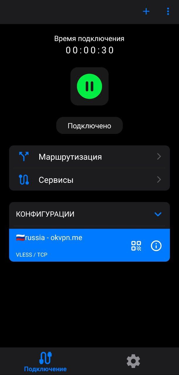 Вам нужен ключ, который выглядит как большая строка со случайными символами и начинается с vless://. Ключ приходит после оплаты, но его всегда можно заново получить, если есть активная подписка на OKVpn